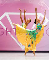 競爭異常激烈的專業組比賽在8日全面展開。年齡幼小却頗具“大范兒”的Angela An先聲奪人,無論是柔婉的傣族舞《魚》,還是深沉的現代舞《That’s the Way It is》都有遠超年齡的成熟和舞技,分獲一、二等獎和“激情寶寶”評委特別獎。隨後的9~11歲專業組獨舞比賽中,Michelle Lai的傣族舞《雨竹林》時而激情迸發、歡快活潑,時而輕緩舒展、柔美深情;Grace Li的古典舞《笛中花》細膩婉轉,典雅輕盈,均獲一等獎並且肩闖入獨舞高分Top 10,再次雙雙獲邀參加Spotlight全國精英舞蹈隊。Grace的另一支現代舞《Hurt》也榮獲二等獎及“優雅舞姿”評委特別獎。在我們首度參加的專業組雙人舞和小型集體舞比賽中,Michelle Lai和Grace Li身著絢麗的傣族舞服,憑藉默契的配合和婀娜的韵致完美地展現了《孔雀女孩》“雙飛敞畫屏,雲翻彩衣輕”的靚麗造型,榮獲一等獎、最佳服裝獎及專業組雙人舞Top 1;Michelle Lai,Grace Li, Iliana Rong,Katherine Zhao的《四隻小天鵝》更是初試啼聲就一鳴驚人,一舉奪得一等獎、“舞姿精準”評委特別獎及專業組小型集體舞Top 1 大獎。更令人欣喜的是,在所有舞校根據各自最高分的三支專業獨舞所獲總分進行的綜合排名中,Michelle Lai和Grace Li的三支獨舞綜合分數拔得頭籌,斬獲Triple Crown大獎,爲興堅舞蹈學校三天的賽事畫上了完美的句號。