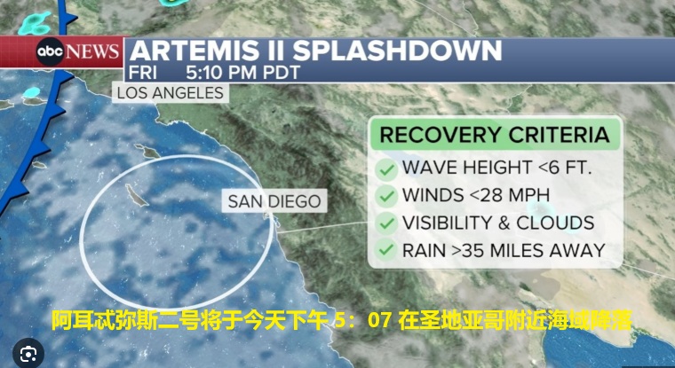 【《华人》传媒 2026年4月10日】根据 NASA 的回收计划,阿耳忒弥斯二号(Artemis II)将于2026年4月10日(今天)太平洋时间下午 5:07(5:07 p.m. PDT)降落在太平洋海域距离圣地亚哥(San Diego)大约 60 至 100 英里(约 97 至 161...
