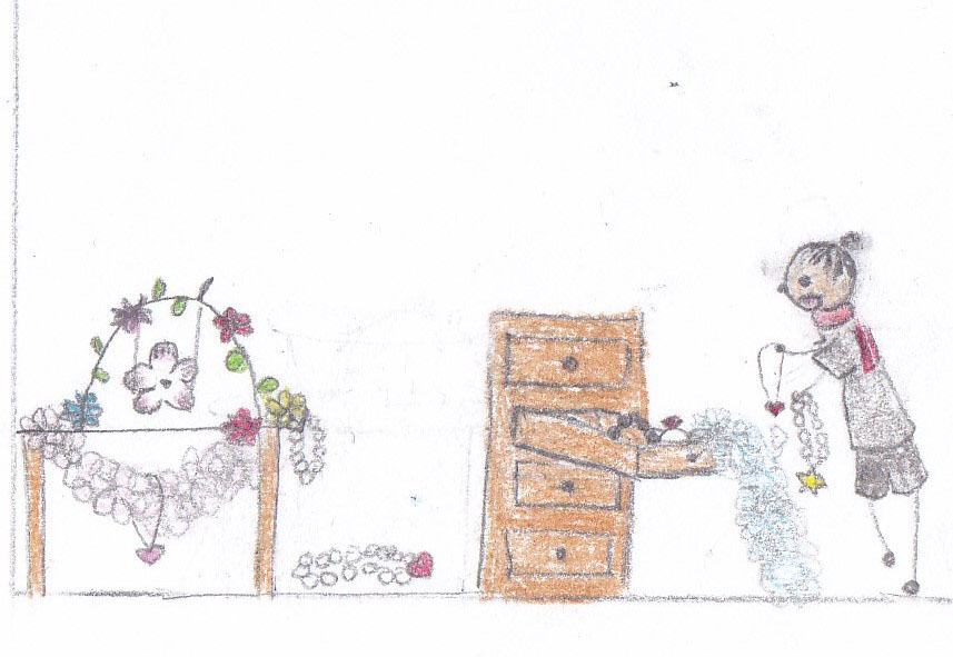 今天一早起來打掃衛生, 看到孩子壁橱裏的一個抽屜沒有關好, 裏面裝的是歷年來積攢的孩子的髮夾、發帶和響應學校 “打扮起來”的各種飾物。我看到一個夏威夷風格的圓形花環被折成了一個半圓形,綁上了彩帶,還纏繞上了一些寶石和項鏈。這是誰做的呢? 是個王冠嗎?