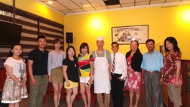 二、欄目組與金城老闆娘黃惠明(左五)、大師傅李慶彪(左六)、經理Simon(右四)、黃錦鈞(右二)、特邀吃貨嘉賓helen Feng(右三)合影。李師傅他從事飲食行業二十年,拿手好菜多多。黃惠明的哥哥黃錦鈞負責打理餐館之餘,酷愛唱歌,是有名的金嗓子。