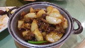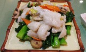 海魚之中,石斑是最受歡迎的,它的魚味清甜鮮香,肉質硬中帶脆,無論是清蒸、炒球、紅燒、甚至燉湯,都是美味。這也就是它永遠占據昂貴海魚的首位,是高級酒宴中絕不能少的一道名貴菜式。來到金城,我首先就點了一課翡翠斑球。所謂翡翠,即是指綠色的菜,這是用以伴碟之用,包括芥藍,露笋或是西蘭花。因爲石斑的味濃鮮甜,用這些青菜伴碟,以中和其鮮甜味,這是很好的配搭。呵呵,金城裏的翡翠斑球就如它的樣式一樣美味。(Feifei)