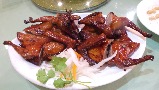 琵琶乳鴿,是廣東菜中的一道傳統名菜,乳鴿顧名思義,即是生長期在20天左右的雛鴿,金城酒家的乳鴿,選料精良,胸脯肉飽滿肥厚,肉質細嫩,營養豐富,易于消化,其次,大厨將乳鴿從胸骨順刀劈開,腌好的乳鴿展開成,"琵琶狀",表皮光滑,皮脆肉香,色澤紅亮。乳鴿不僅鮮美,而且具有一定的藥用價值:有滋補肝腎之作用,可以補氣血,托毒排膿,對於腎虛體弱、心神不寧、兒童成長、體力透支者均有功效。(Cici)