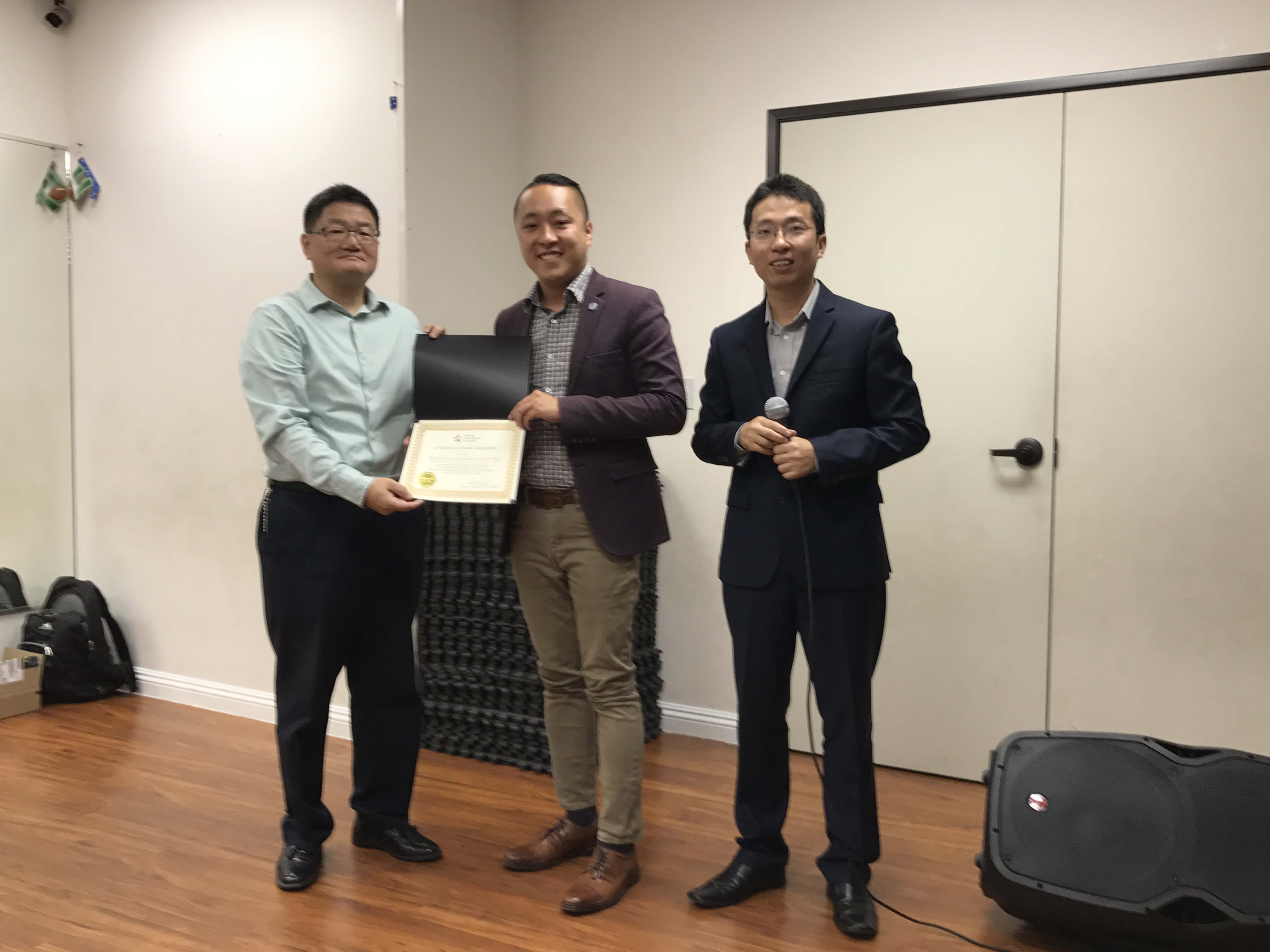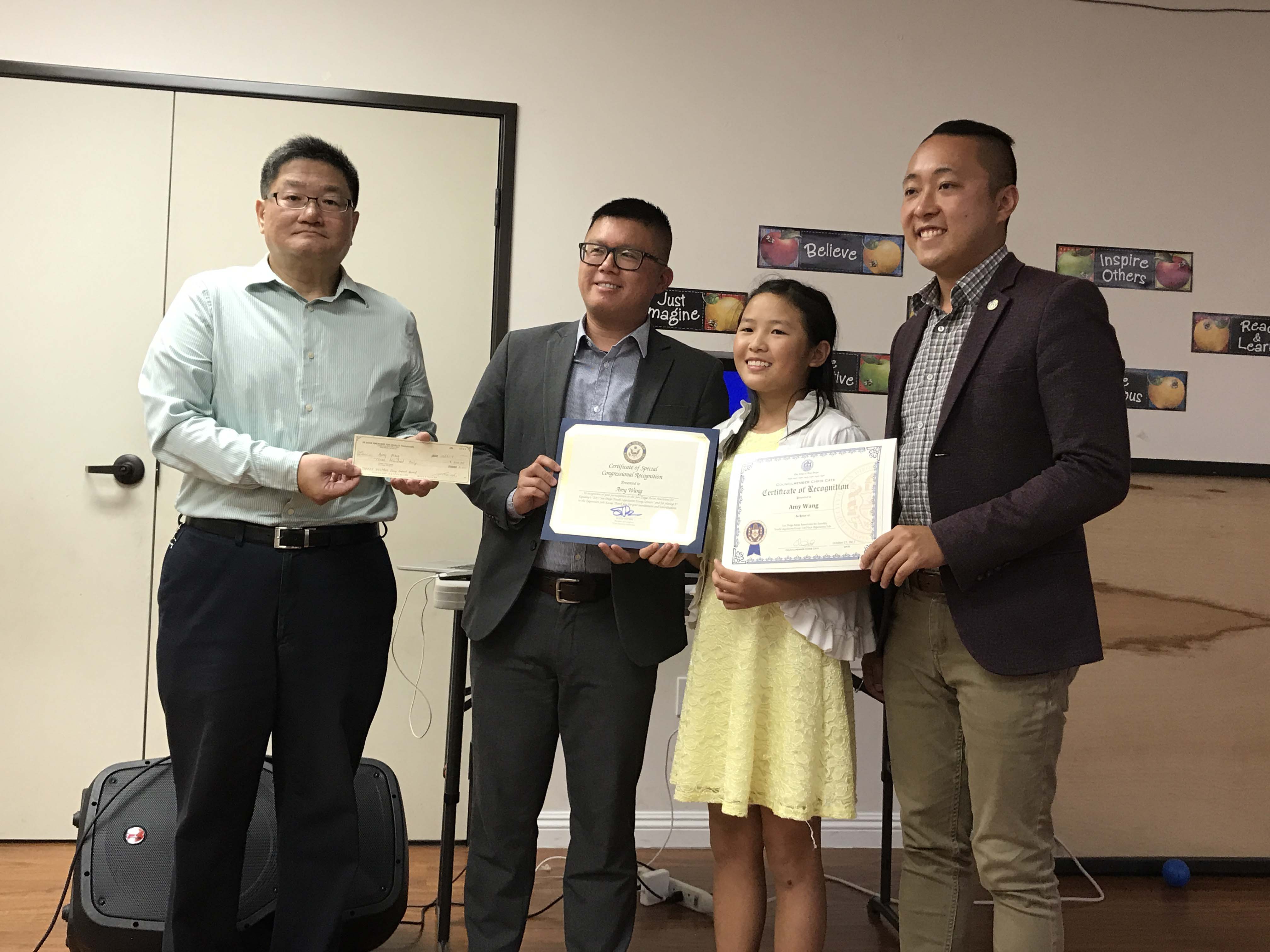 2017年10月27日晚上7时,圣地亚哥亚裔平权会在恩典中文学校大厅举办了 首届圣地亚哥青少年立法论文大赛的颁奖典礼。国会议员Scott Peters、市议 员Chris Cate分别派Anthony Nguyen和Allen Young作为代表参加了这次颁奖 典礼,并与副会长谢家树一起为获奖同学们颁奖。