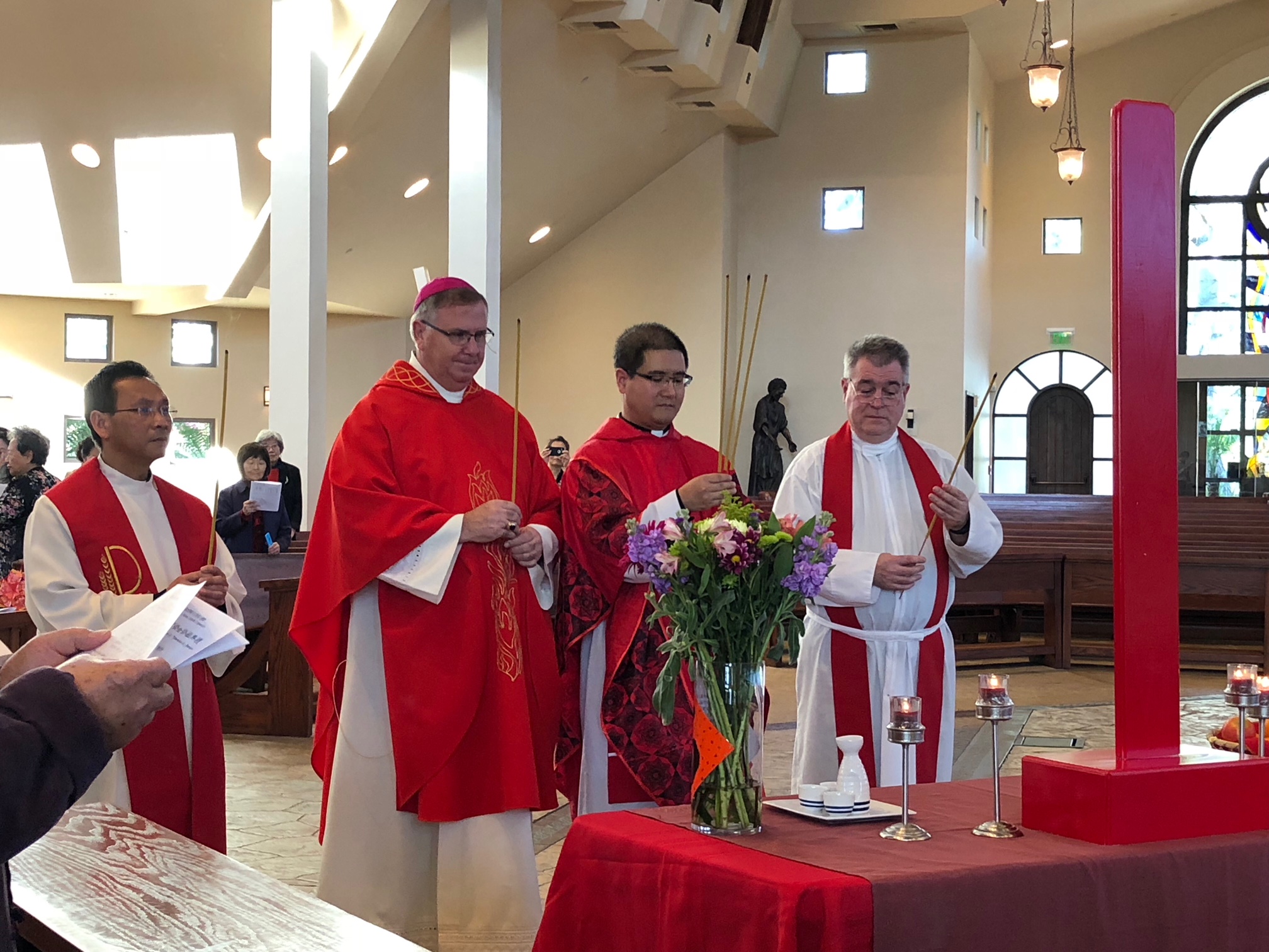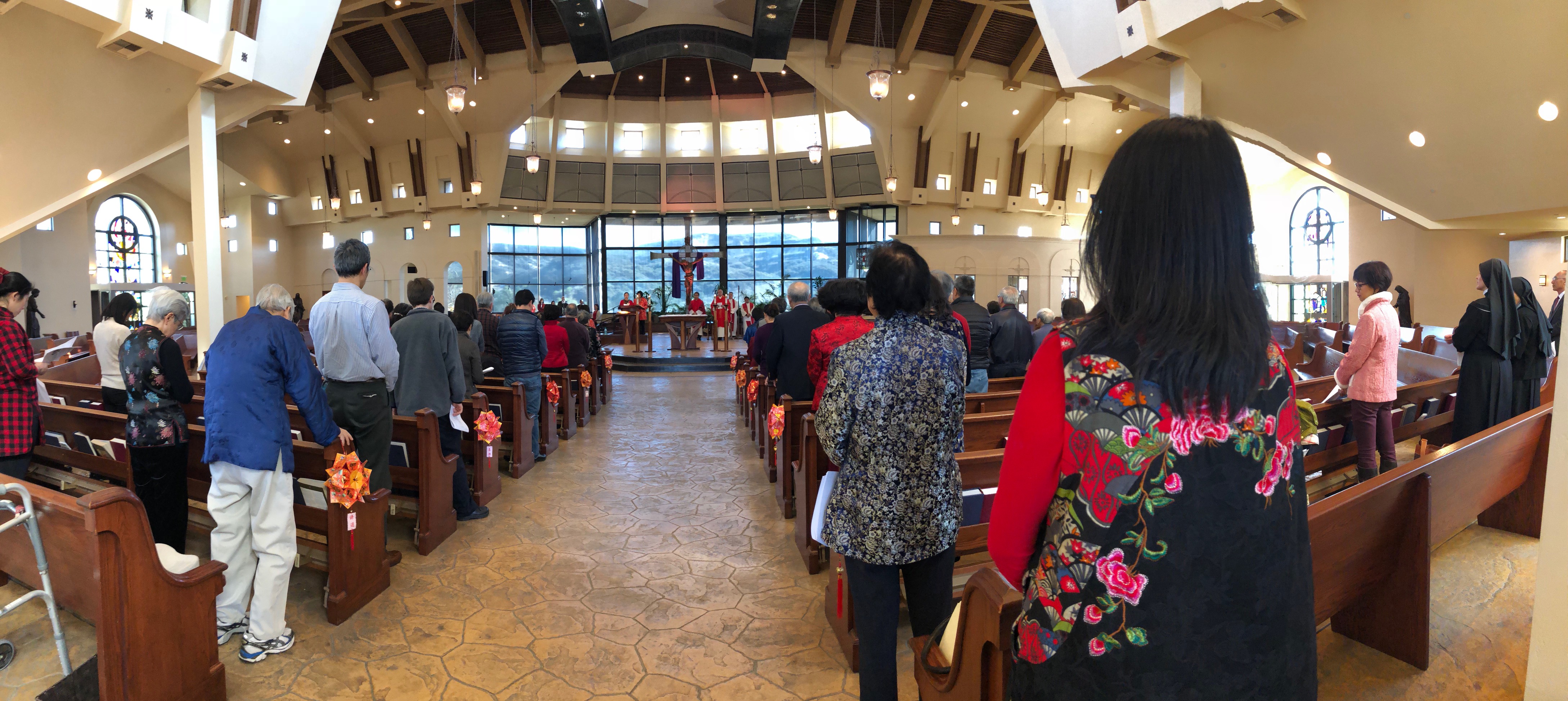 聖地牙哥 天主教華人團體 San Diego Chinese Catholic Community (SDCCC) 於二月二十五日下午在 所屬本堂 St. Therese of Carmel Church (4355 Del Mar Trails Road, San Diego, CA 92130 ) 舉行2018 年新春彌撒及敬天祭祖典禮。聖地牙哥教區主教 Auxiliary Bishop John Dolan 主祭,Fr. Anthony Yang、Fr. Michael Pham 以及 本堂神父Fr. Chris Tozzi 等三位神父共祭。