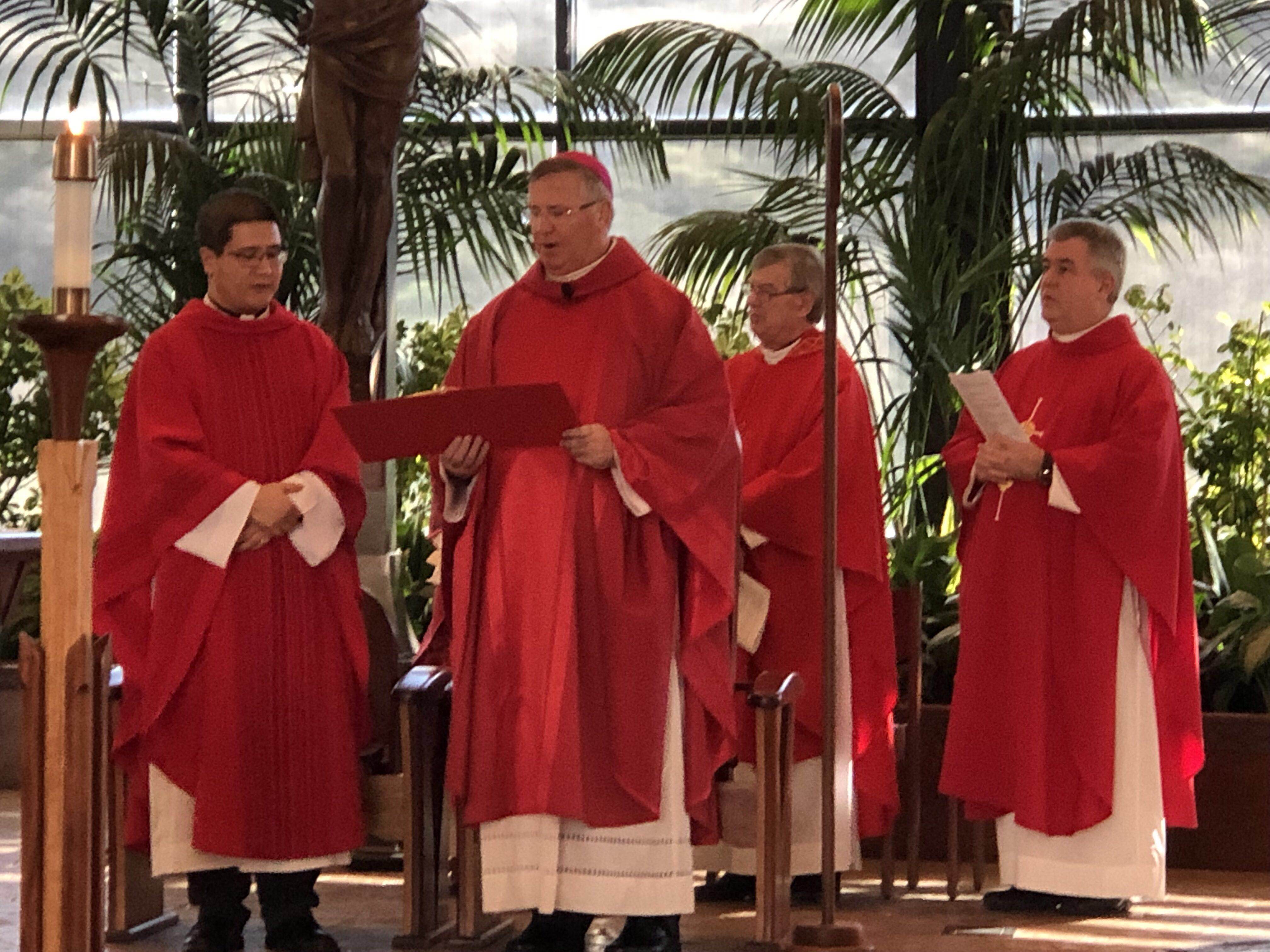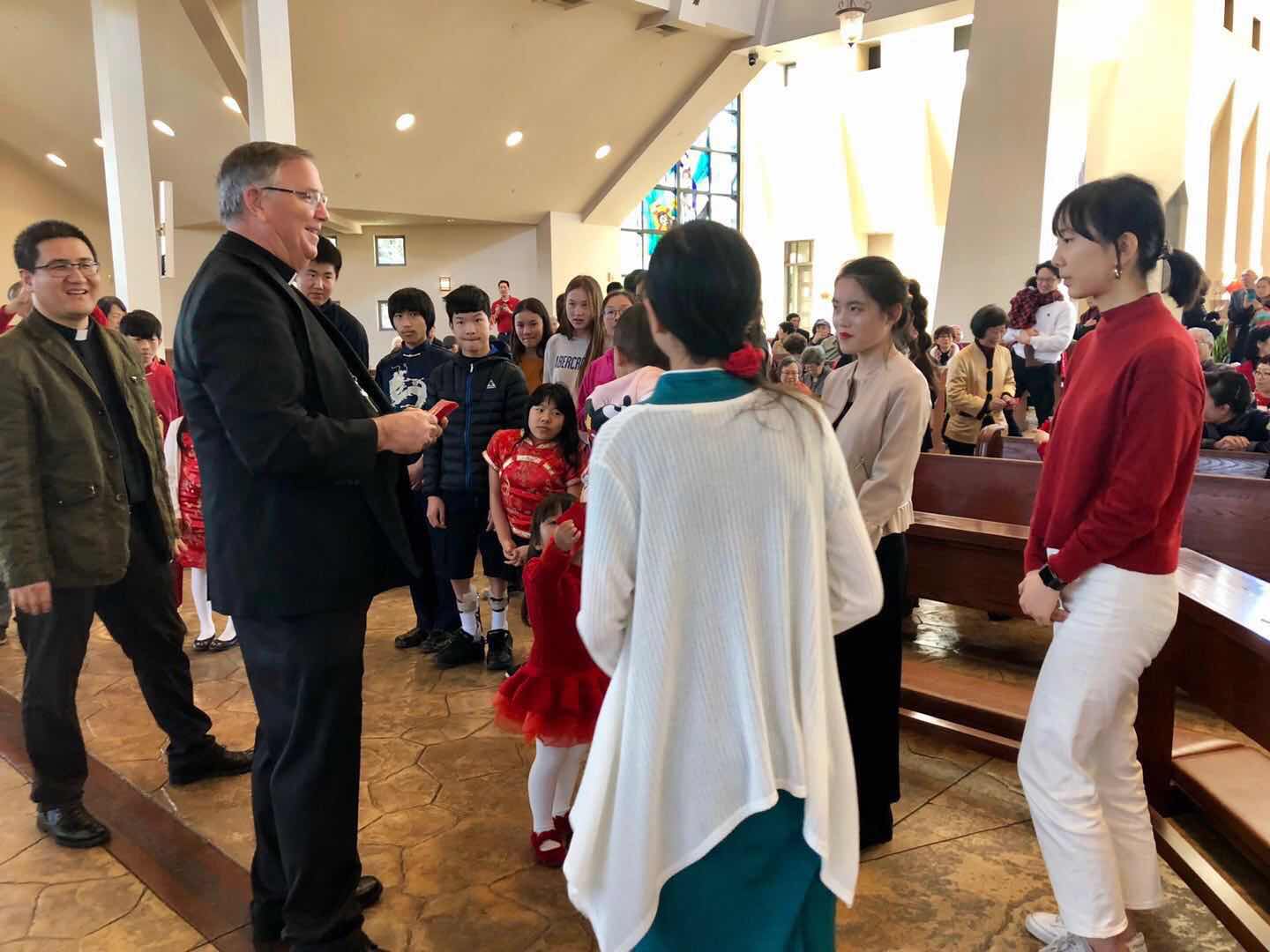 聖地牙哥天主教華人團體 San Diego Chinese Catholic Community (SDCCC) 於二月九日下午在所屬本堂 St. Therese of Carmel Church (4355 Del Mar Trails Road, San Diego, CA 92130 )舉行2019 年新春彌撒及祭祖典禮。聖地牙哥教區主教 Auxiliary Bishop John Dolan 主祭,Fr. Anthony Yang、Fr. Michael Pham, Fr. Nick Dempsey 以及本堂神父Fr. Chris Tozzi等四位神父共祭。彌撒結束後的祭祖典禮由主教、四位神父、中外教友及親朋好友共一百多位,個別向列祖列宗上香,獻花,獻果並行三躹躬禮,場面莊嚴肅穆。
