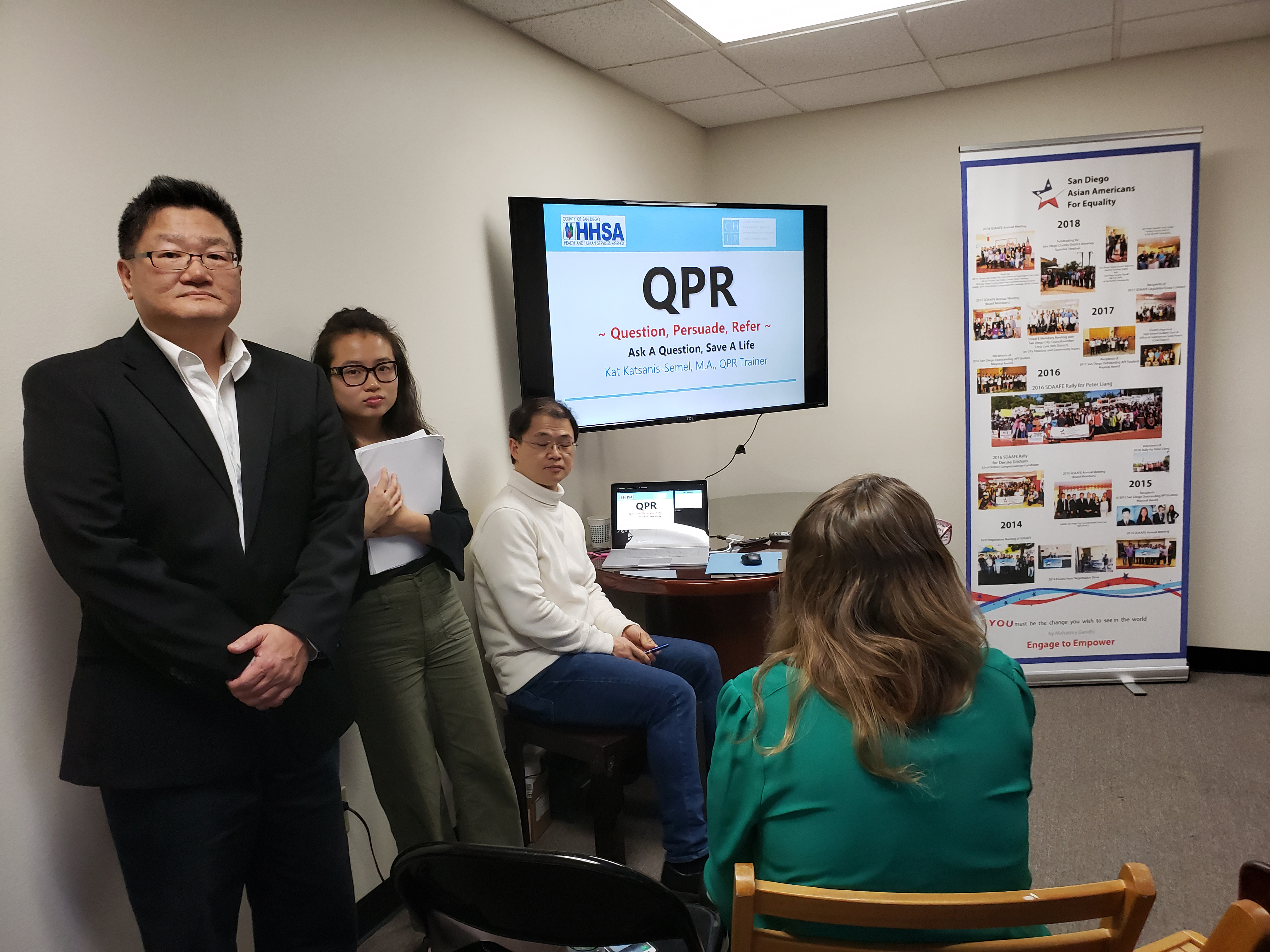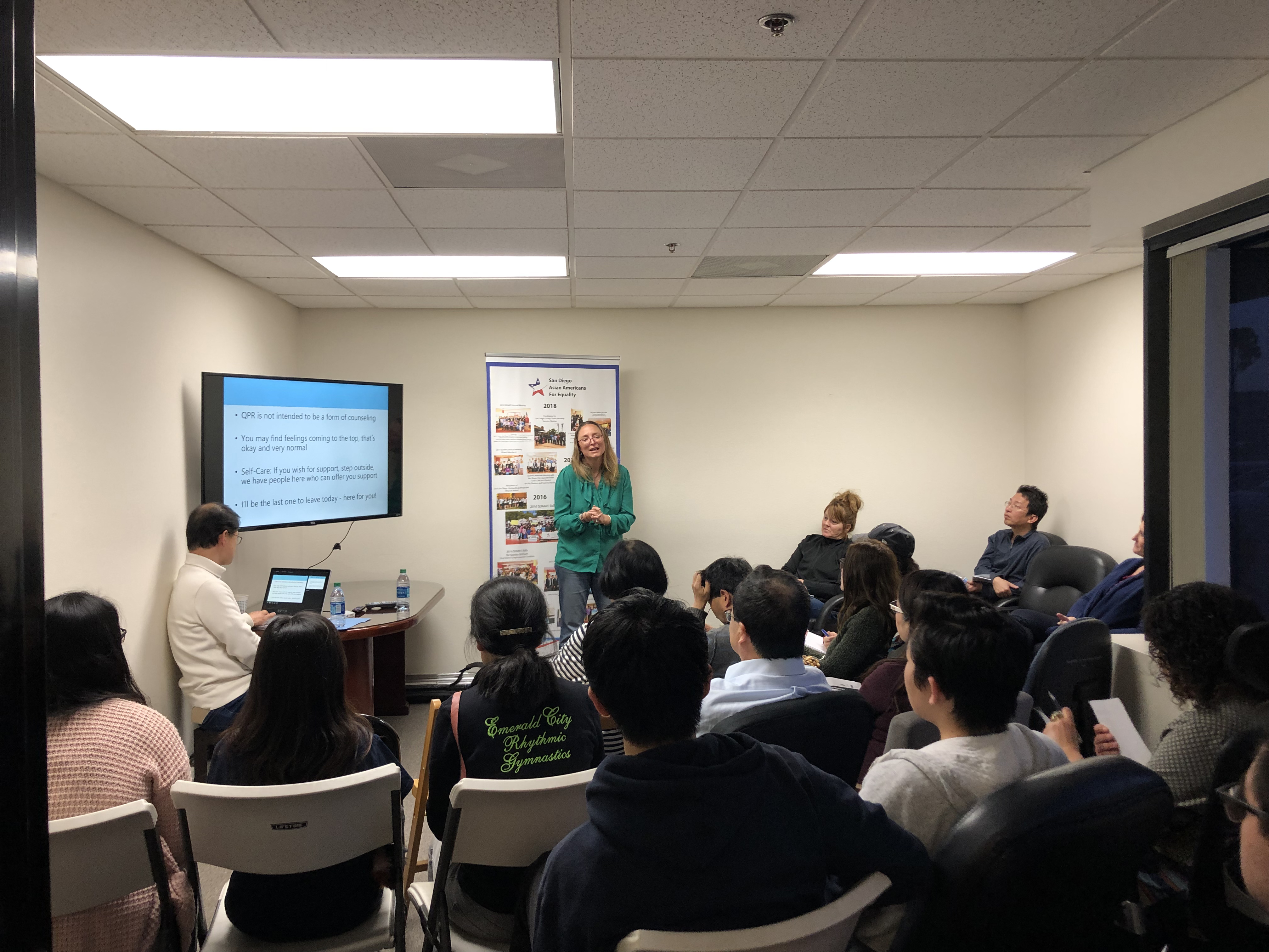 特約記者言行遠報導", 平權會提供照片聖地牙哥亞裔平權會(San Diego Asian Americans for Equality, SDAAFE)(簡稱平權會)與聖地牙哥預防自殺委員會(San Diego County Suicide Prevention Council, SPC)於3月16日聯合舉辦預防自殺講座:Question, Persuade, and Refer (QPR) Gatekeeper Trainings for Suicide Prevention。