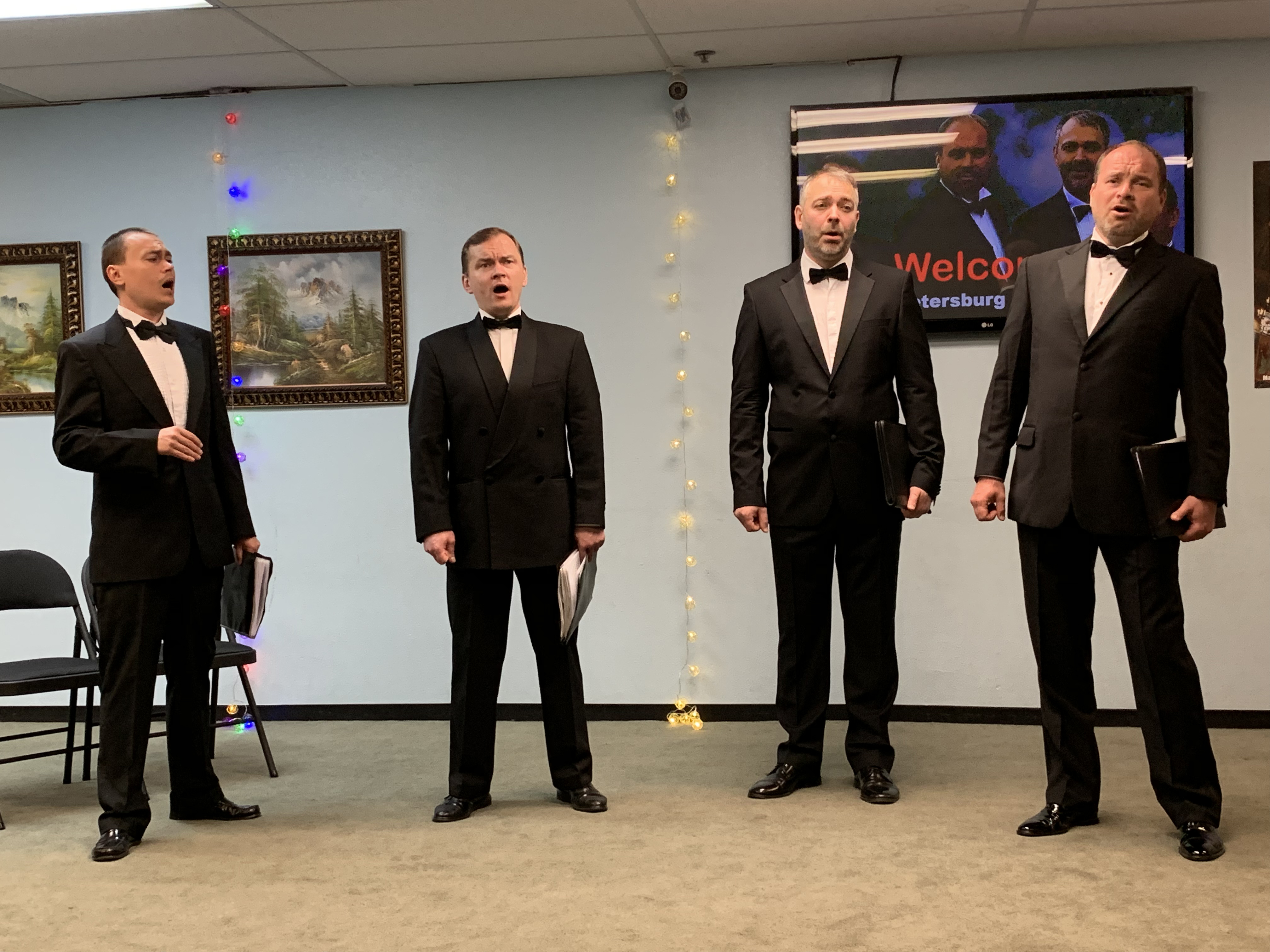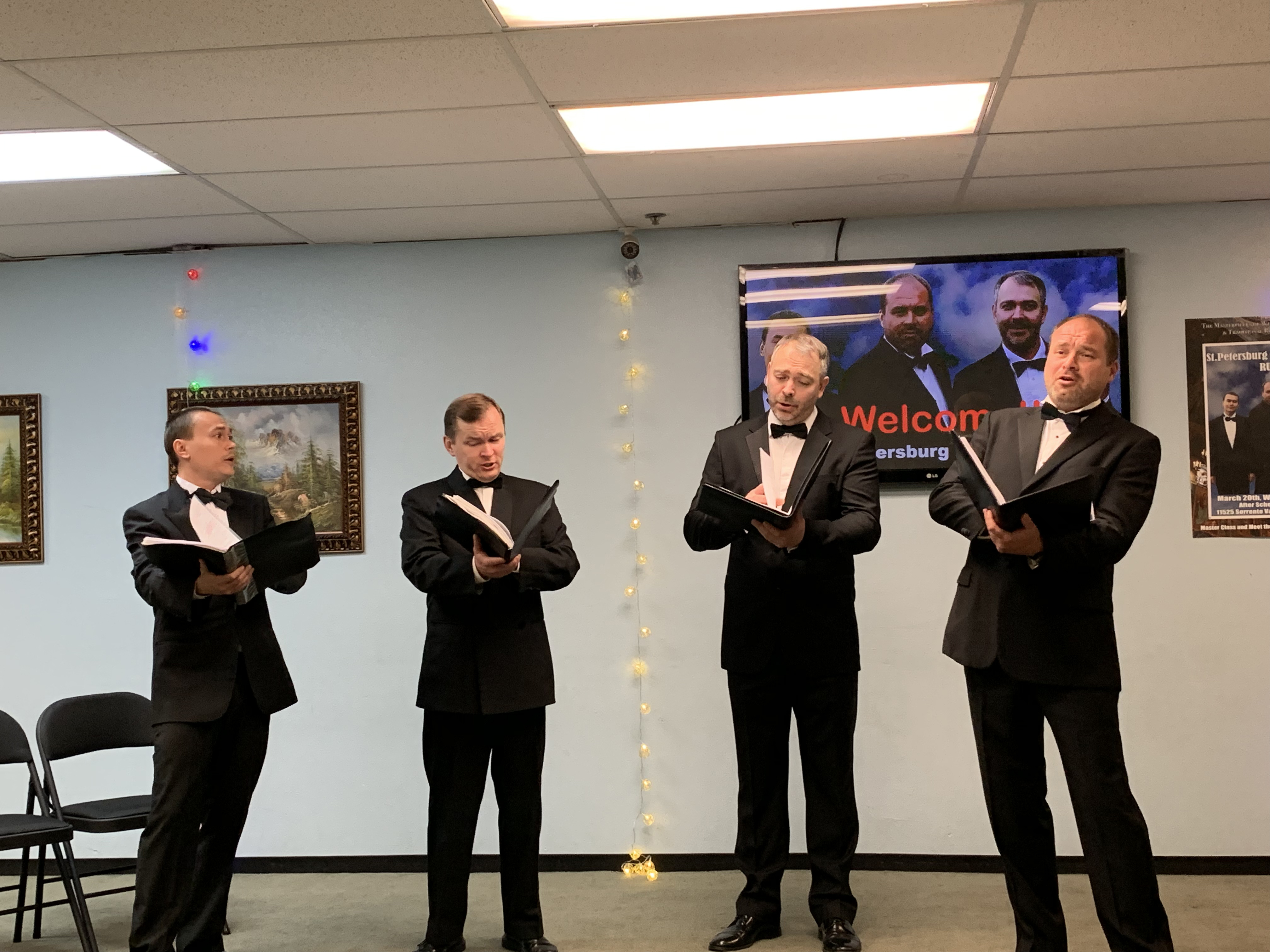成立於2003年的聖彼得堡男聲合唱團是由四位歌唱家組成的專業演唱團體,他們不僅在世界各地演唱,也在教會歌唱,同時大力推出俄羅斯民間歌曲。當晚音樂會,四位歌唱家首先為大家演唱了六首經典歌曲和宗教歌曲,他們之間絕美的和聲配合,令前來的每一個人都開了眼界。之後,聖地亞哥聲樂愛好者協會的二十多位團員在合唱團藝術總監蔡則平教授的指揮下,也演唱了兩首經典歌曲,業餘合唱團居然唱出專業水平。接下來,四位歌唱家為聽眾獻上六首俄羅斯名歌,如《莫斯科郊外的晚上》、《伏爾加漁夫曲》、俄羅斯民間舞曲等,這些熟悉的歌曲,激起強烈的迴響。在歌唱家的演繹下,更是美不勝收,音樂會氣氛達到高潮。演唱結束後,四位歌唱家又熱情地回答了與會者提出的不少問題。
