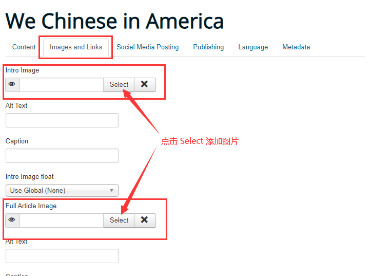 --进入 Images and Links 分页, 点击Select选择照片,具体方法同上。已有照片可直接选择,新照片请上传。Intro Image和 Full Article Image可以是同样的照片。