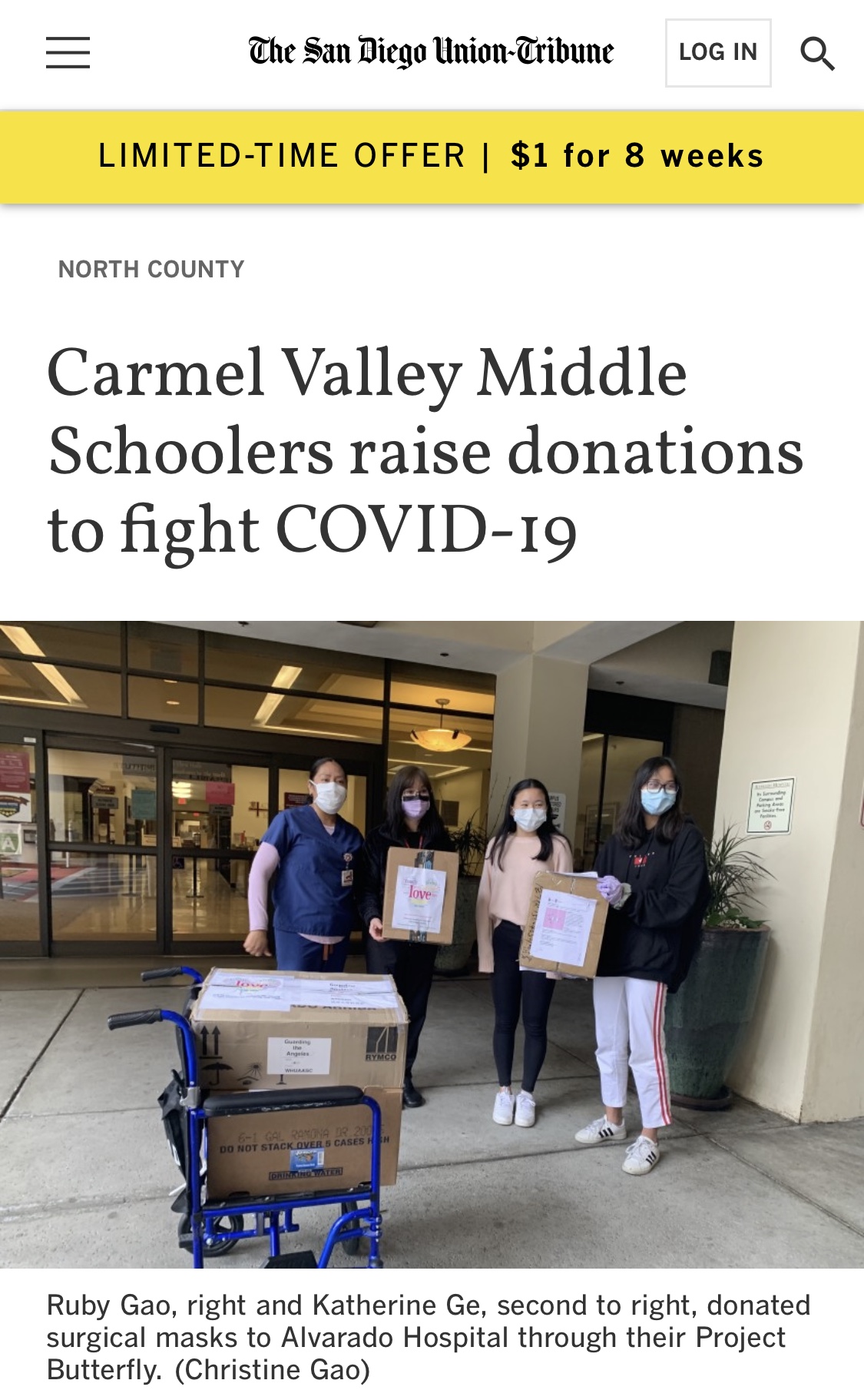 在2020年席卷全球的新冠病毒抗疫活动中,华人社区众志成城,薪火相传,众多华人青少年组织也积极参与,涌现出很多令人感动的人和事,其中包括圣地亚哥华人女孩高润琪(Ruby Gao)和葛馨宜(Katherine Ge)及其创建的蝴蝶项目(Project Butterfly)。