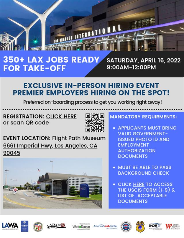 【We Chinese in America Media Editor Tang Zhao, April 9, 2022】 Los Angeles World Airports (LAWA) is partnering with Unibail-Rodamco-Westfield Airport to host a job fair on...