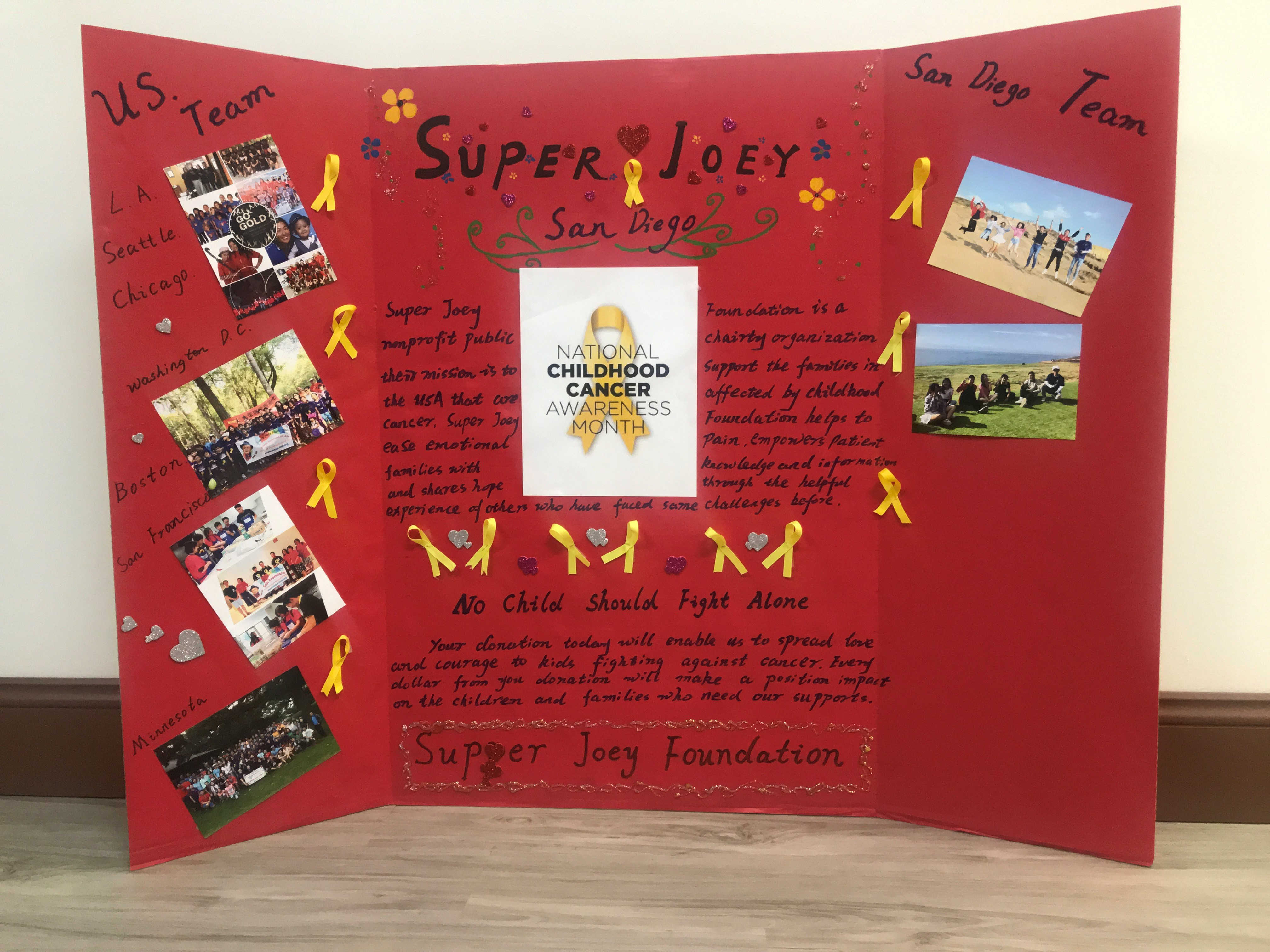 Super Joey Foundation是以一位名叫JOEY的小男孩的名字命名的。JOEY在2岁的时候得了癌症,他崇拜超级英雄。他心里的超级英雄们陪他渡过了无数次化疗和手术带来的煎熬。Joey爱笑。他的微笑感染和鼓舞着身边同受病痛折磨的小病人们。因此人们开始叫他Super Joey。Joey在四岁时离开了我们。他的父母希望“Love Will Never Fade”,于2016年成立了Super Joey 基金会。基金会本着“No Child Should Fight Cancer Alone”的信条来帮助患癌儿童。在成立后短短的三年里,基金会迅速发展, 自愿团队已遍及美国十几个城市和地区,帮助过上千病患家庭。