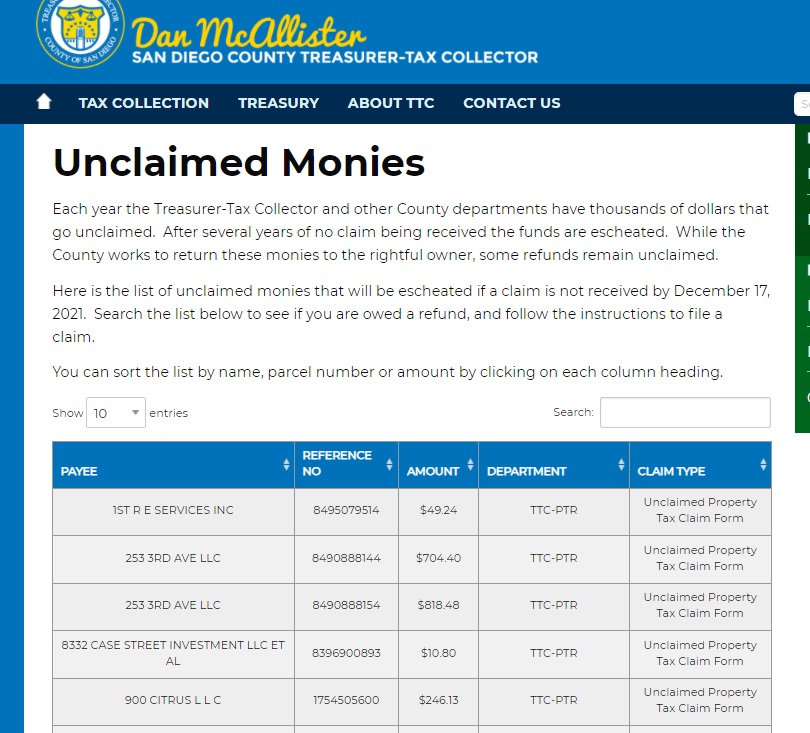 如果读者中是圣地亚哥郡的房产税纳税人,不妨上网查一下是否有退款在等待你认领: Property Tax Refunds (sdttc.com)