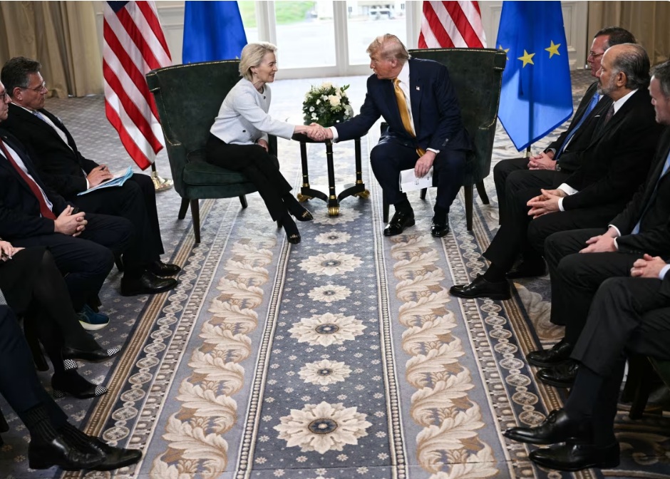 【《华人》传媒 2025年7月28日】美国总统唐纳德·特朗普周日宣布,在与欧盟委员会主席乌尔苏拉·冯德莱恩于苏格兰坦伯利会谈后,美欧达成了一项贸易协议框架。